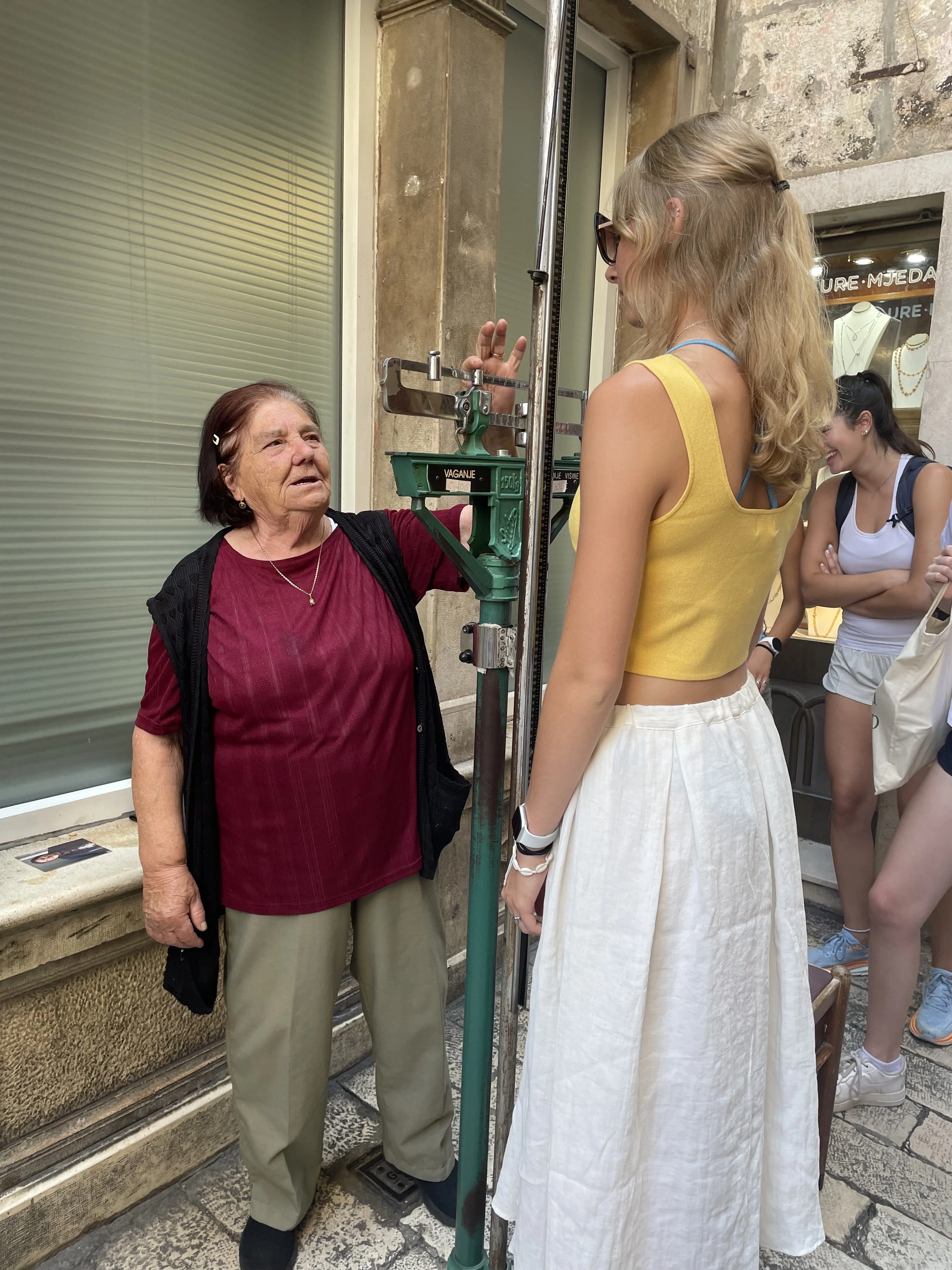 The history of Croatia is inspiring as the territory was ruled by the Republic of Venice for over 400 years. However, despite the Italian influence, the local people preserved their own traditions. We continue to walk as we pass a corner and stop to see an older woman standing with a traditional weighing scale. “This is a legend in our city” declares Anna. The woman is leaning against the windowsill behind her with a paper cup on display for small change. Her name is Maria and Anna translates as she explains that for generations, it was known that you could come to the city to get your height and weight measured on the street as no one had scales at home. Maria smiles as she tells us that her mom had done this for 30 years before she passed and she feels that it's her obligation to continue the family tradition. Even though people now have scales in their homes, she enjoys offering the service and many local people appreciate and support her. Maria and I do not speak the same language however, I was able to understand the sense of pride she has for her family and culture from the genuine tone of her voice and the slight smile washed upon her face. Maria has an appreciation for tradition.