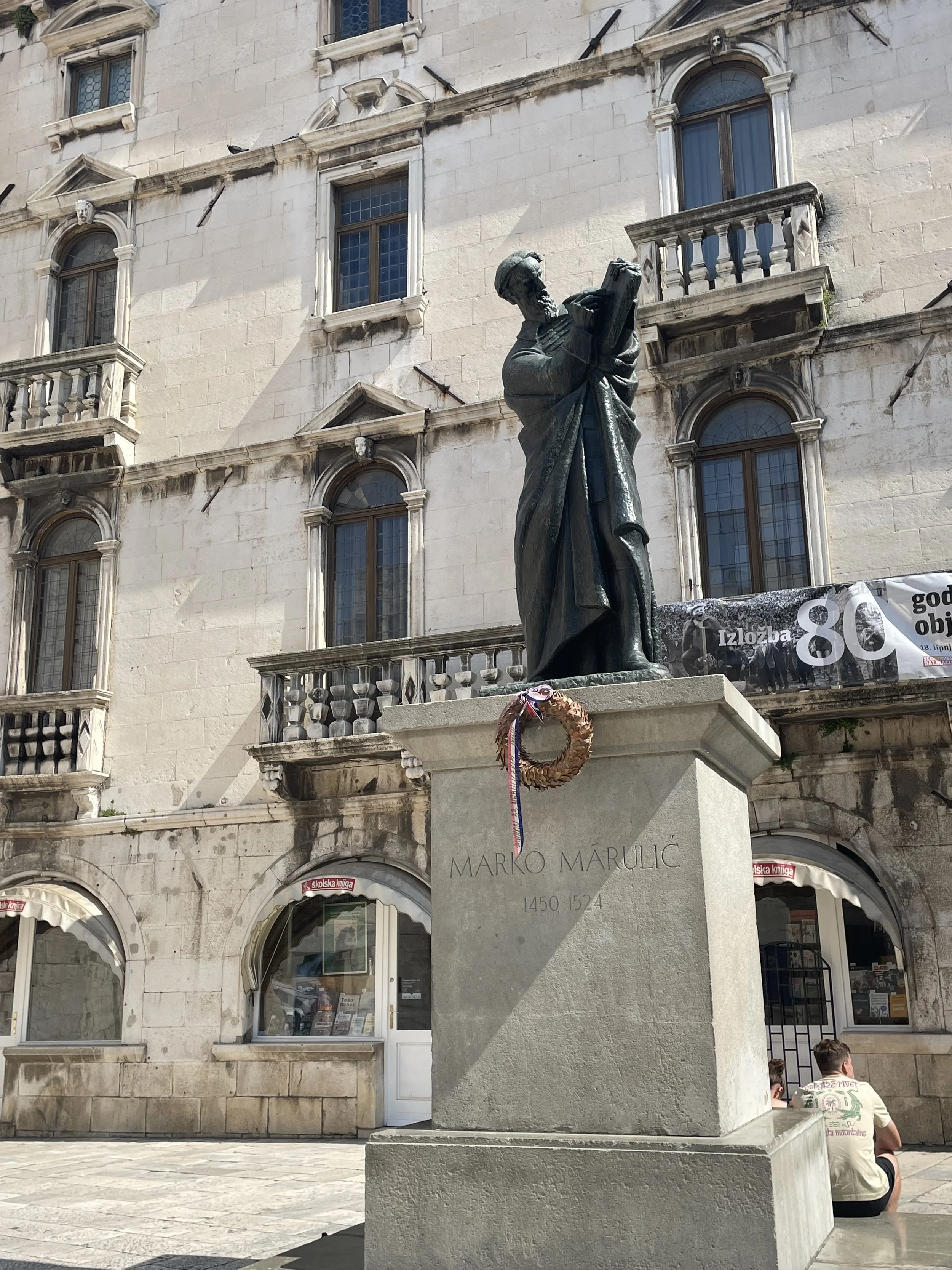 We eventually reach the fruit square. Anna explains that it is named the fruit square because it used to be a fruit market decades ago. “In Split, when something gets named, the name stays forever.” In the middle of the fruit square stands the father of Croatian literature, Marko Marulić. This man wrote the first poem in the Croatian language which gave courage to local people to fight against Turkish invasion. I stand there looking up at this statue which signifies bravery and courage. I imagine myself as a local. Retrieving inspiration from this statue as it reminds me of how my people had to fight for their culture. It would encourage me to do the same thing in the current world.